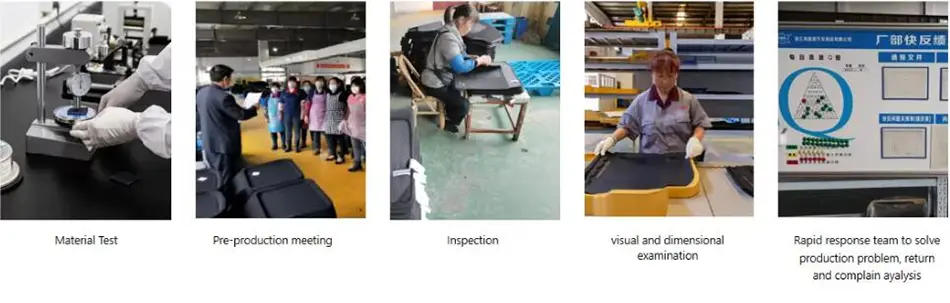 Vi er fullstendig i samsvar med ISO9001 for design og produksjon av bilmatter, ISO/TSI16949 for kvalitetskontroll, ISO14001:2015 for miljøledelse, BSCI for sosialt ansvar og EU REACH-standarder for råvarer. Vi har interne testfasiliteter for å utføre egenkontroller for å sikre at produktene våre består tester utført av SGS, Intertek eller en hvilken som helst annen tredjepartsinspektør som kundene måtte kreve.