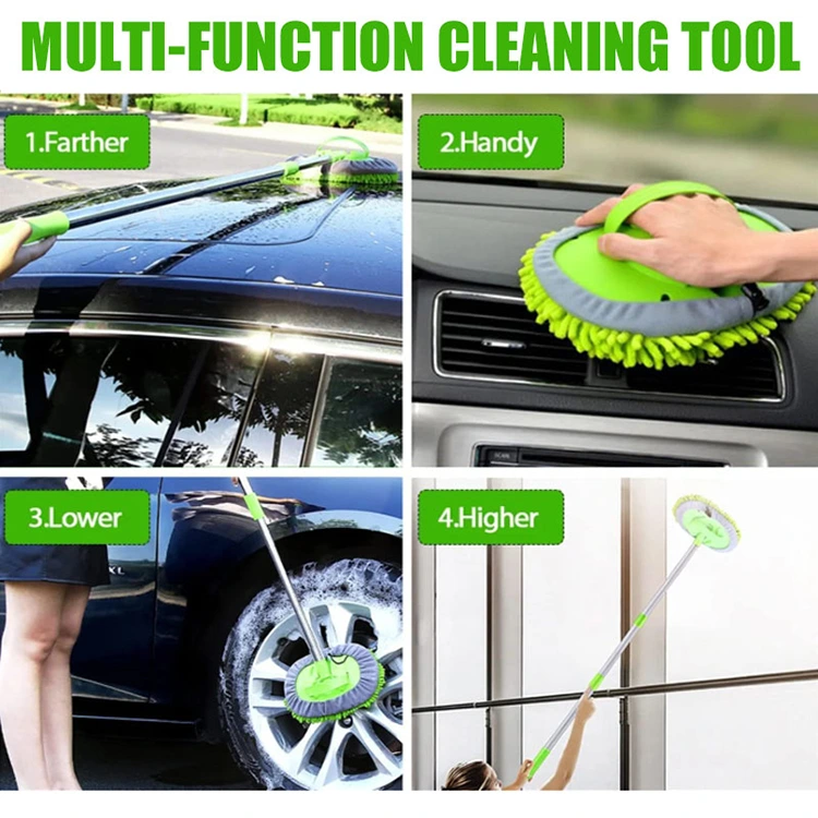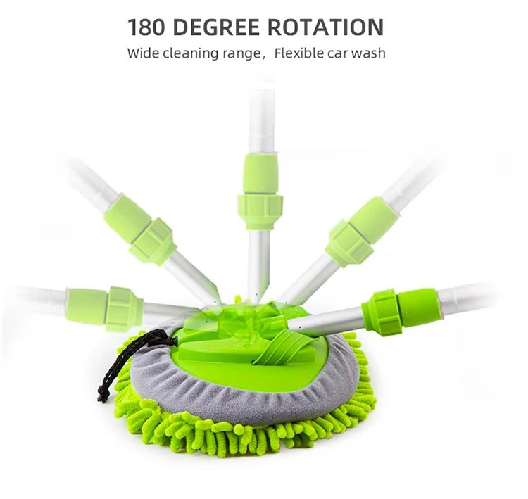 Den teleskopiske bilvaskmoppen, kalt en vannstrømsbørste, gjør bilvask enklere og mer effektiv. Det er ikke nødvendig å bøye seg eller bære en vannbøtte – koble en slange til toppen av håndtaket, og vannet strømmer direkte gjennom børsten. Det teleskopiske aluminiumshåndtaket strekker seg for å nå høye områder og kan tas helt av for nærrengjøring av bilflater og vinduer. Håndtaket roterer også 180 grader, slik at du kan justere rengjøringsvinkelen for bedre dekning og bekvemmelighet.